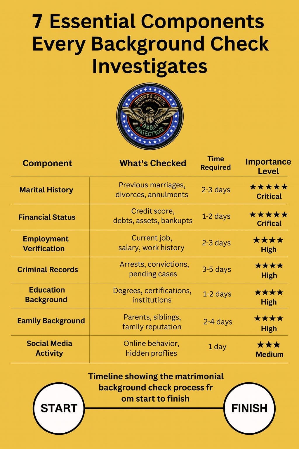 Beyond standard matrimonial background checks, you may also need specialized relationship investigations. Explore our comprehensive guide on pre-matrimonial investigations and partner verification which covers dating background checks, online matrimonial fraud detection, and relationship history verification.
